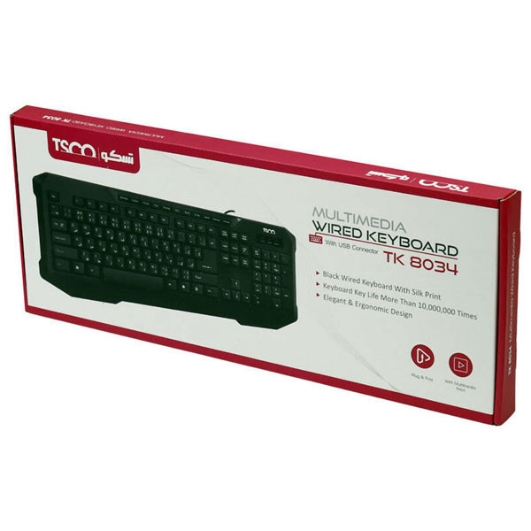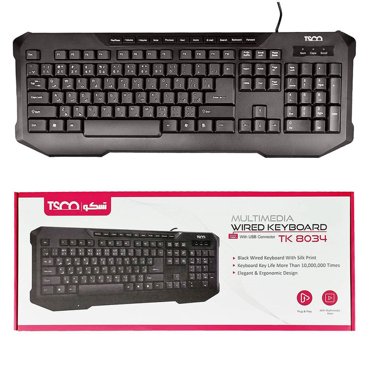 فرقی ندارد یک کارمند اداری، دانشجو یا دانش آموز یا یک فرد خانه دار باشید، اگر شما در روز برخی از امور خود را با کمک رایانهتان انجام میدهید نیاز به لوازم جانبی باکیفیت و بادوام دارید تا بدون ایجاد هرگونه مشکل به سریع و راحتترین شکل ممکن کارهای خود را انجام دهید. از پر مصرف ترین لوازم جانبی رایانهها میتوان به کیبوردها اشاره کرد که کیفیت مطلوب و دوام بالا در آنها بسیار حائز اهمیت است. کیبوردها باید دارای طراحی ارگونومیک و کلیدهای نرم و راحت داشته باشند تا به هنگام تایپ با آن انگشتان دچار آسیب و خستگی نشوند. کیبورد تسکو مدل TK 8034 از محصولات منحصر به فرد و خوشساخت این برند است که از کیفیت بالایی برخوردار است و متریال به کار رفته در تولید آن نیز کیفیتی مطلوب دارد. یکی از کیبوردهایی که میتواند تجربه دلنشینی از کار و بازی به شما بدهد مدل TK 8034 است. این محصول در ابعاد 2.6*18*47.5 سانتیمتر و وزن 10±520 در رنگ مشکی طراحی، تولید و روانهی بازار فروش شده است. کیبورد تسکو مدل TK 8034 سیمی بوده و از طریق پورت USB قابل اتصال به کامپیوتر یا لپتاپ است که طول کابل آن 1.8 متر بوده که سازگار با انواع سیستم عاملهای Win10/8/7/2000/98/XP/ME/NT/vista است. در تولید کیبورد تسکو مدل TK 8034 از 115 کلید و 11 کلید میانبر و کاربردی استفاده شده که عمر ضربههای آن به 10 میلیون ضربه هم میرسد و همچنین دو چراغ نمایشگر برای کلیدهای Caps Lock/Num Lock بر روی کیبورد به چشم میخورد.