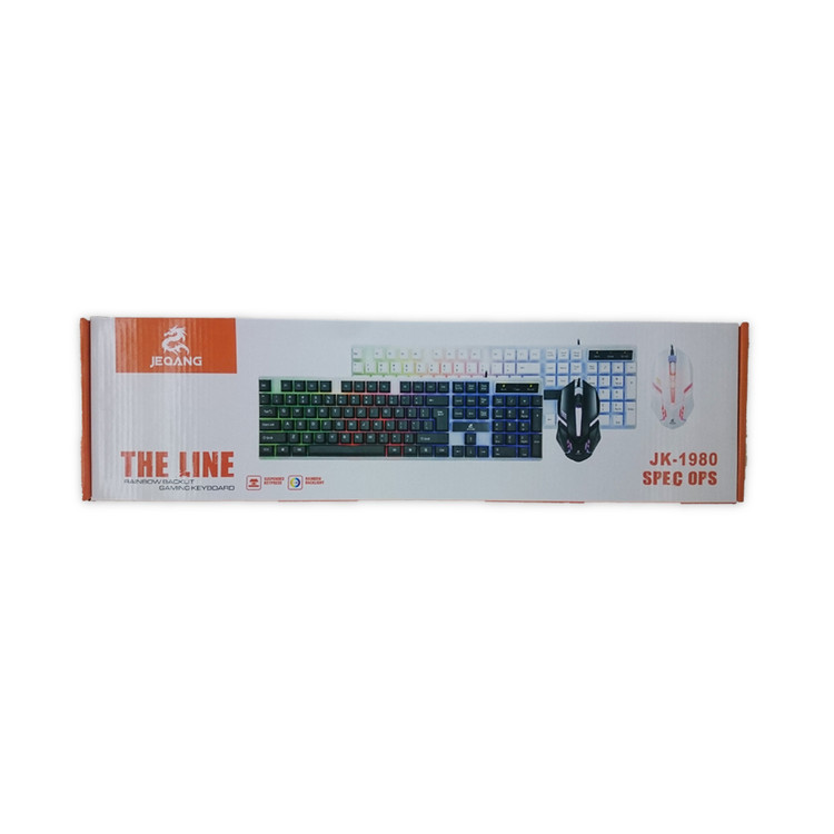 کیبورد و ماوس مخصوص بازی جکنگ مدل JK_1980 یک کیبورد و ماوس مقرون به صرفه و در عین حال با کیفیت است که با نورپردازی زیبای خود توجه هر کاربری را به خود جلب میکند. نورپردازی کیبورد سه رنگ به صورت ثابت در کناره های کلید ها است و نورپردازی ماوس به صورت چند رنگ و قابل تغییر به صورت اتوماتیک است. این محصول با استفاده از دو عدد کابل USB (یک عدد برای ماوس و یک عدد برای کیبورد) به دستگاه مورد نظر شما متصل میشود و با همه ی پلتفرم ها از جمله PC و PS4 سازگار است. این نسخه از محصول حروف حک شده فارسی روی کلید ها ندارد.