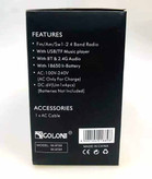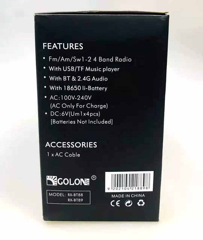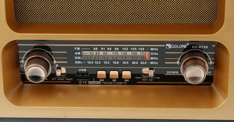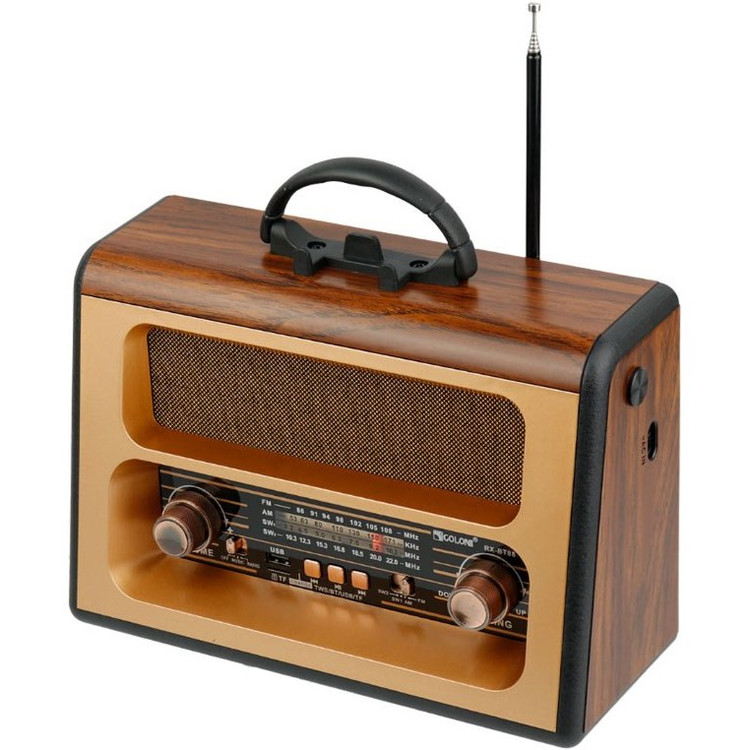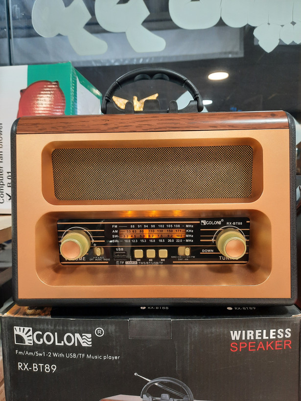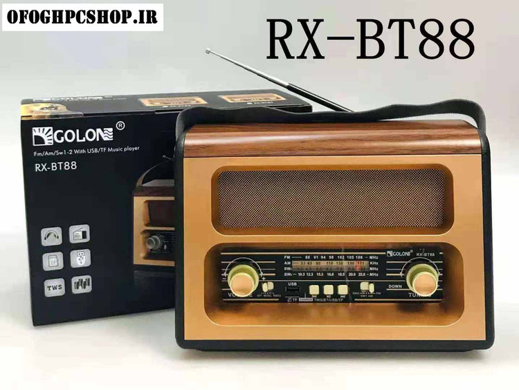 با روی کار آمدن شبکه های مجازی و اینترنت همچنان رادیو طرفداران پرو پا قرص خود را دارد . این دستگاه با طراحی کلاسیک به شکل رادیوهای قدیمی اما با کارکردی امروزی می باشد که توانایی پخش فایل های صوتی با فرمت MP3 را از طریق بلوتوث و درگاه های ورودی USB و پورت کارت حافظه SDدارد. رادیوی گولون مدل RX-BT88 علاوه بر امکان استفاده از برق شهری ، با داشتن باتری داخلی قابل شارژ و امکان استفاده از 6 باتری معمولی مدل UM-1 در همه جا میتواند همراه خوبی برای شما باشد .در این محصول به دلیل سهولت در حمل دسته تعبیه گردیده است . با داشتن 4 موج رادیو دیگر نگران از دست دادن برنامه رادیویی مورد علاقه خود نباشید .با خرید این محصول کاربردی شما تنها صاحب یک رادیو نگردیده اید بلکه صاحب یک پلیر قوی هم شده اید .با داشتن آنتن تلسکوپی بر روی دستگاه به راحتی میتوانید در هر مکانی به ایستگاه رادیویی دلخواه خود متصل و از شنیدن رادیو لذت ببرید . این رادیو باداشتن 3 درگاه ورودی : USB و فلش در سایز SD و همچنین اتصال از طریق بلوتوث میتواند یک پلیر کاربردی با صدای عالی برای شما باشد .