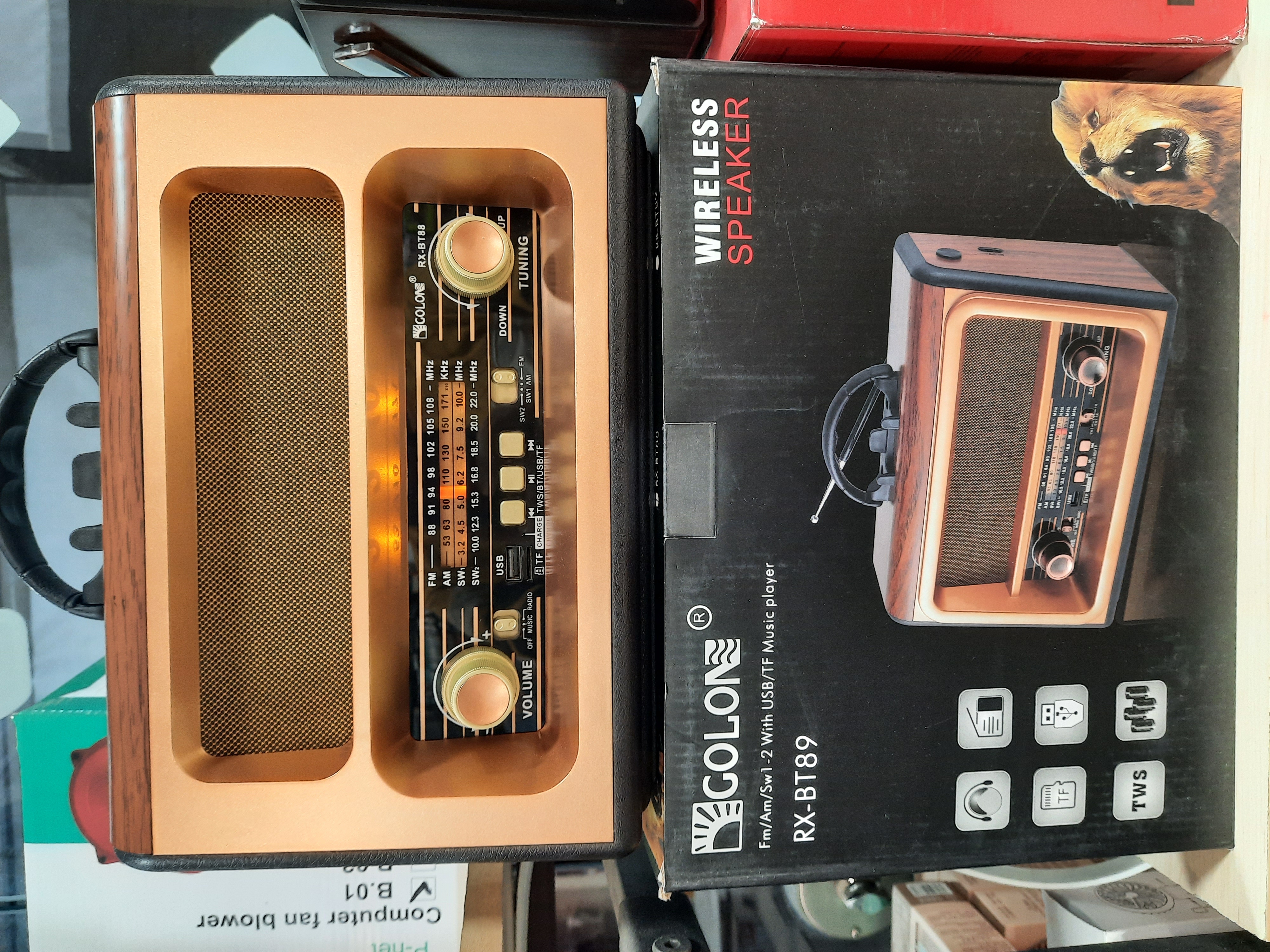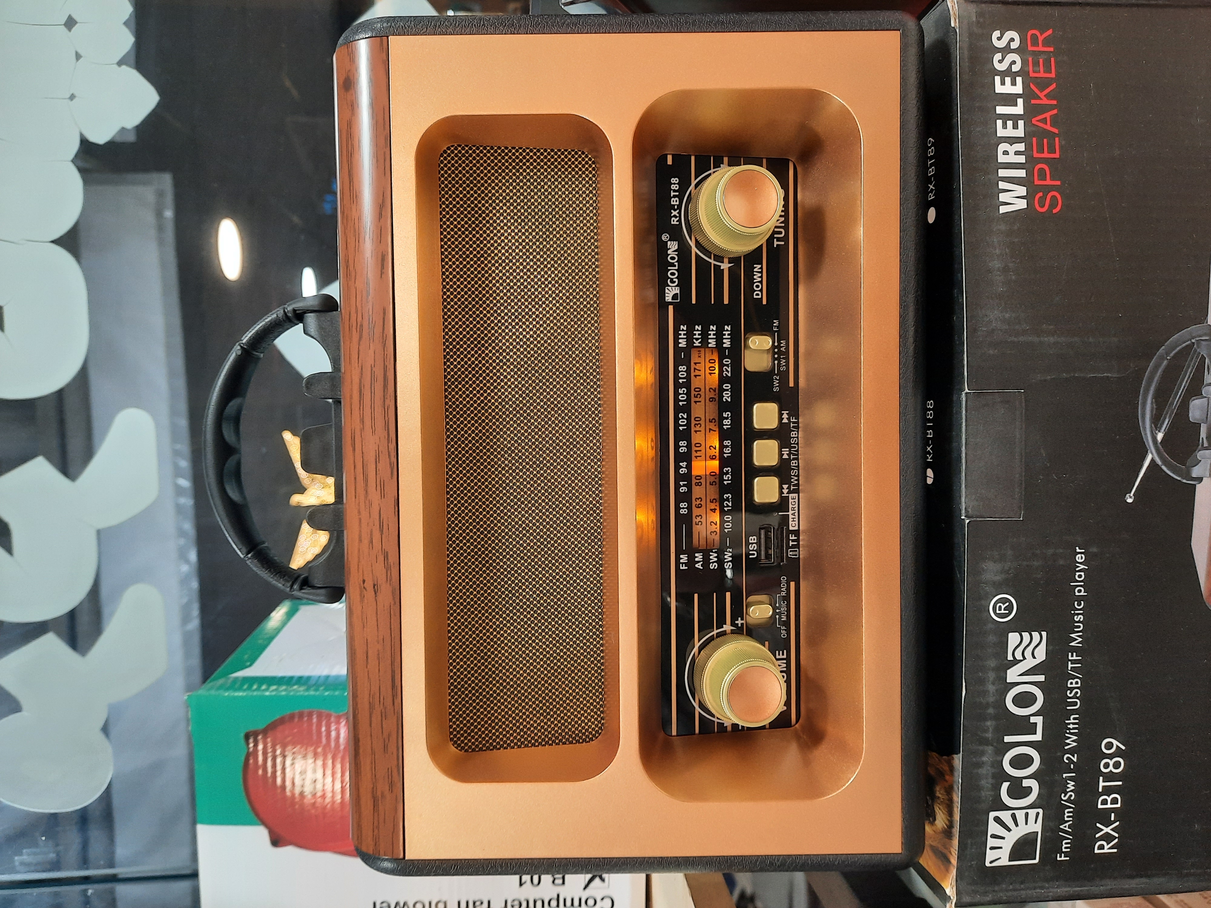 با روی کار آمدن شبکه های مجازی و اینترنت همچنان رادیو طرفداران پرو پا قرص خود را دارد . این دستگاه با طراحی کلاسیک به شکل رادیوهای قدیمی اما با کارکردی امروزی می باشد که توانایی پخش فایل های صوتی با فرمت MP3 را از طریق بلوتوث و درگاه های ورودی USB و پورت کارت حافظه SDدارد. رادیوی گولون مدل RX-BT88 علاوه بر امکان استفاده از برق شهری ، با داشتن باتری داخلی قابل شارژ و امکان استفاده از 6 باتری معمولی مدل UM-1 در همه جا میتواند همراه خوبی برای شما باشد .در این محصول به دلیل سهولت در حمل دسته تعبیه گردیده است . با داشتن 4 موج رادیو دیگر نگران از دست دادن برنامه رادیویی مورد علاقه خود نباشید .با خرید این محصول کاربردی شما تنها صاحب یک رادیو نگردیده اید بلکه صاحب یک پلیر قوی هم شده اید .با داشتن آنتن تلسکوپی بر روی دستگاه به راحتی میتوانید در هر مکانی به ایستگاه رادیویی دلخواه خود متصل و از شنیدن رادیو لذت ببرید . این رادیو باداشتن 3 درگاه ورودی : USB و فلش در سایز SD و همچنین اتصال از طریق بلوتوث میتواند یک پلیر کاربردی با صدای عالی برای شما باشد .